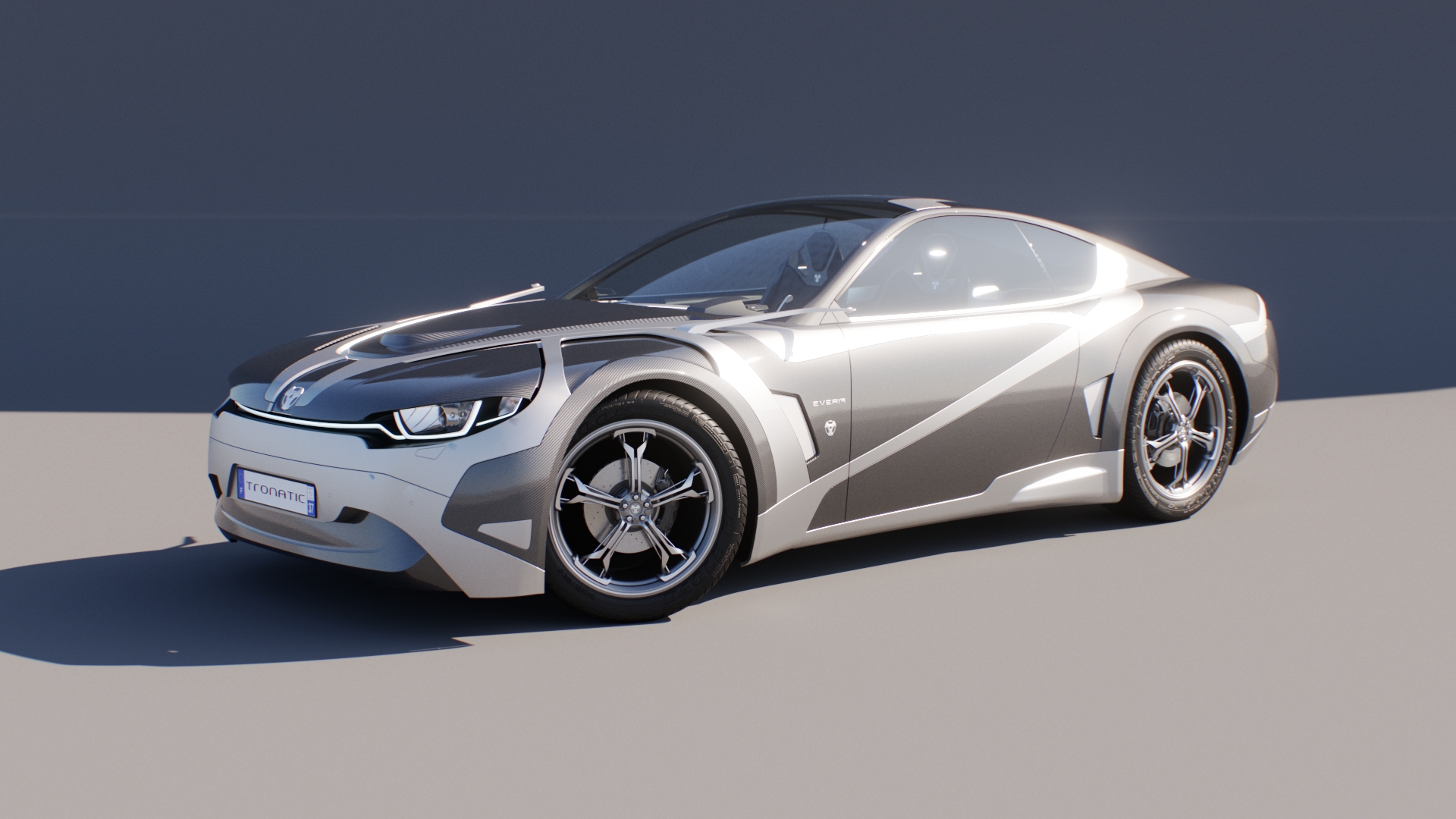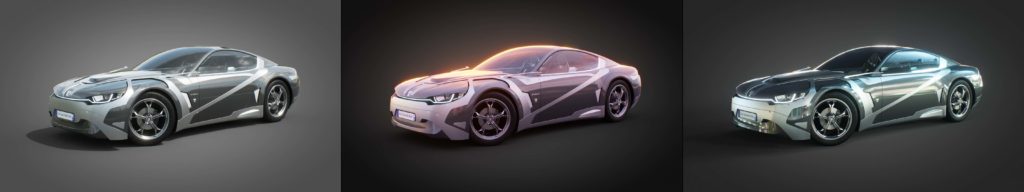 Comme vous pouvez le voir, sur les rendus 3D, les reflets et couleurs des différentes images références, sont présentes sur la voiture Everia grâce aux visuels HDR. L’avantage de la HDRI est donc d’avoir des références lumières précises, d’avoir des ombres cohérentes par rapport au flux de lumière et également les reflets de l’environnement, créant ainsi une réelle ambiance photoréaliste. Pour que votre rendu 3D réagisse avec les mêmes variations lumineuses, il est important de choisir une image de référence en HDR ou EXR. Si l’image de référence est en JPG, les ombres, reflets et lumières seront alors faussés et votre résultat ne sera pas exact.