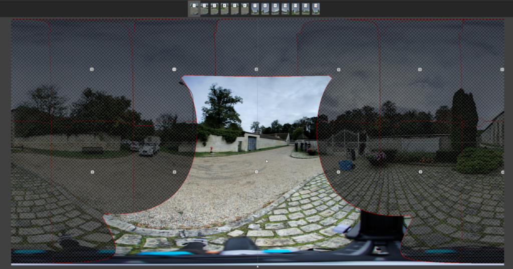 Voici un exemple de stiching réalisé pour l’un de nos projets. Les traits rouges ainsi que le quadrillage représentent les différents bords des images qui ont été stichées (assemblées) ensemble, afin de produire un panorama sphérique.