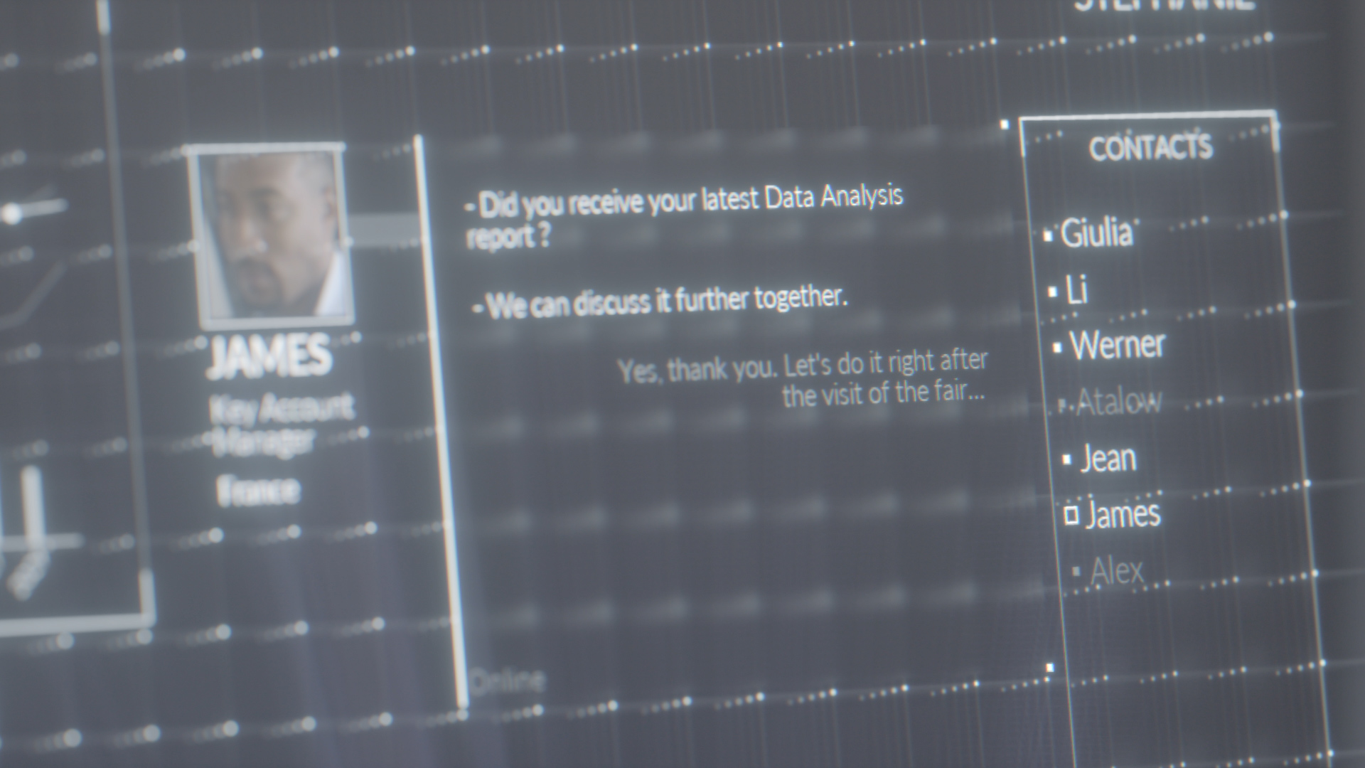 Concernant la post-production, et en totale liberté, nous avons pu apporter une valeur créative au projet en étant force de proposition pour la présentation de l’environnement informatique. En adéquation avec le cahier des charges de notre client, le design de l’interface utilisateur fut pensé et proposé par le studio.