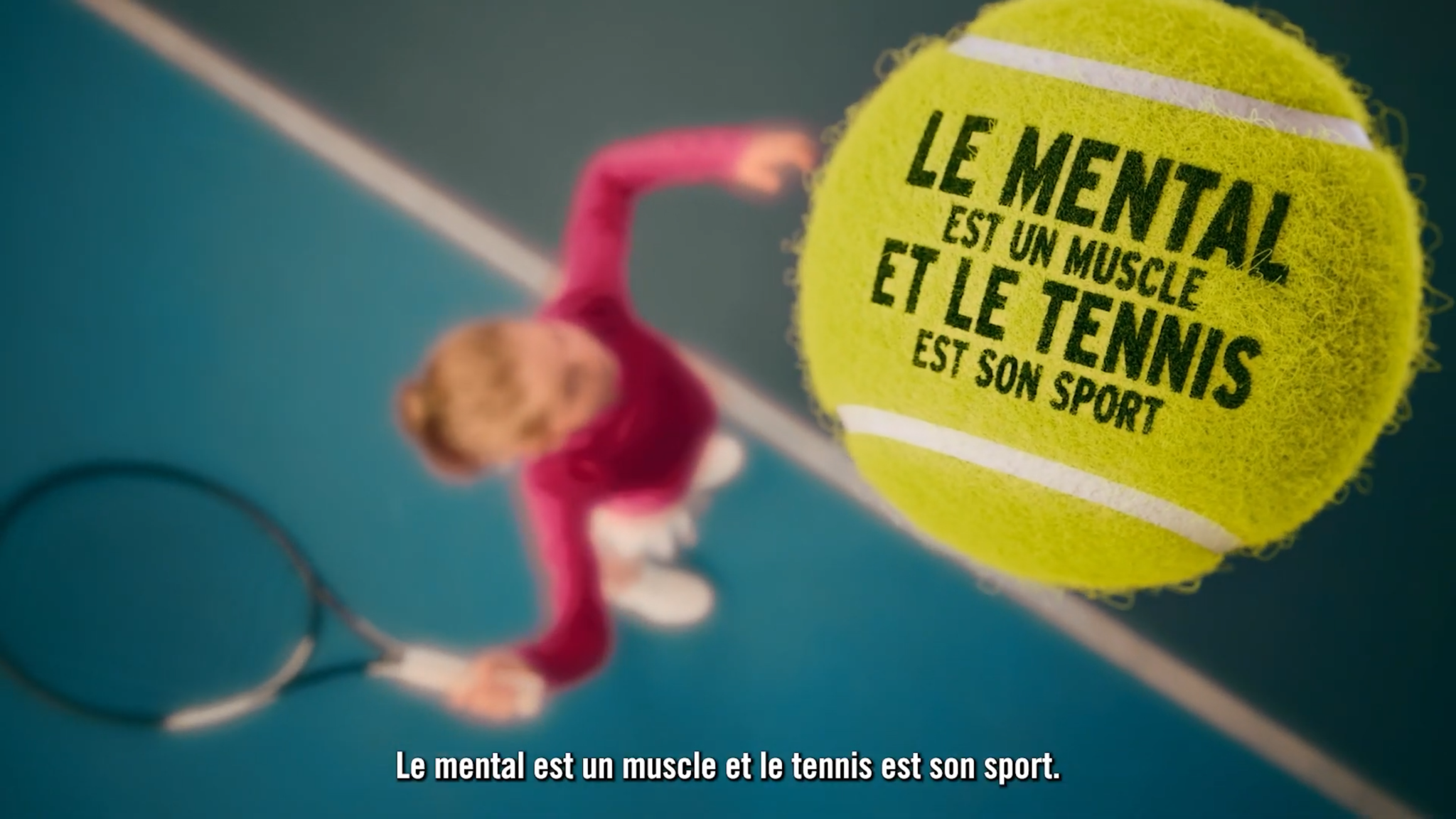 La balle de tennis et la phrase « le mental est un muscle et le tennis est son sport » sont les éléments principaux de cette vidéo. Ainsi, nous avons reproduit la balle de tennis à l’identique en 3D afin d’incruster la phrase. Dans un souci de réalisme, nous avons ajouté des défauts d’impression, des filaments passant devant le texte.