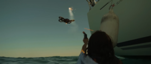 Femme dans l’océan tirant drone avec pistolet fusées de détresse