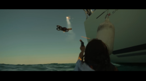 Femme dans l’eau qui tire sur un drone avec une fusée de détresse.