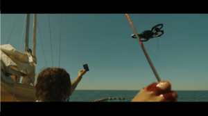 Femme blessée, sang sur la main droite, sur bateau montrant une carte à un drone