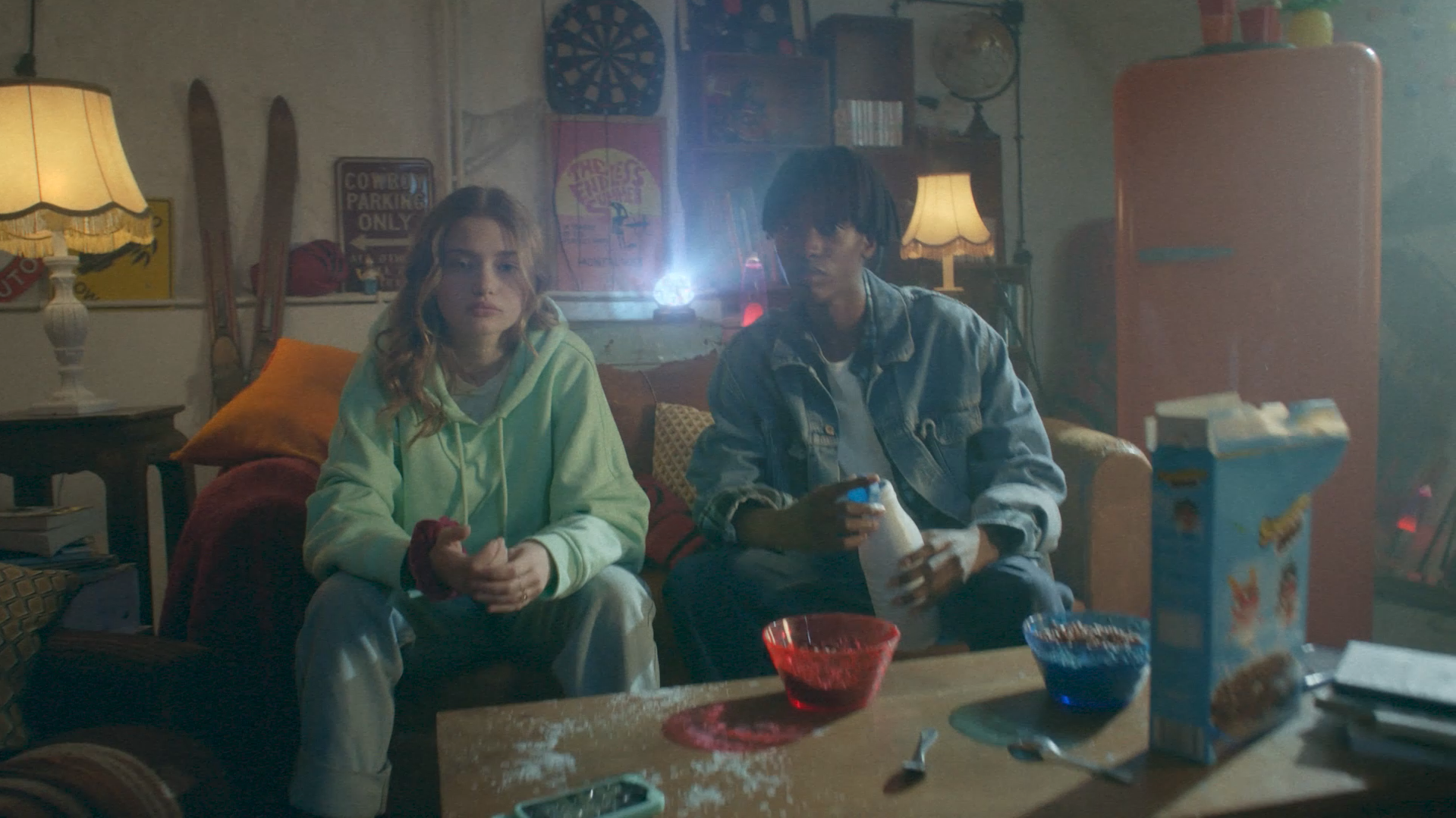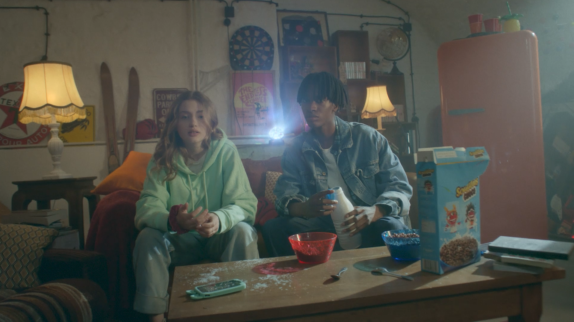 Initialement, les deux jeunes, installés sur un canapé, devaient déguster leurs céréales au lait devant un film projeté par un vidéoprojecteur derrière eux. Cependant, de nouvelles lois interdisent la diffusion de publicités pouvant inciter à manger devant un écran, film, jeux vidéo… La publicité ne pouvant être retournée, une solution devait être trouvée.