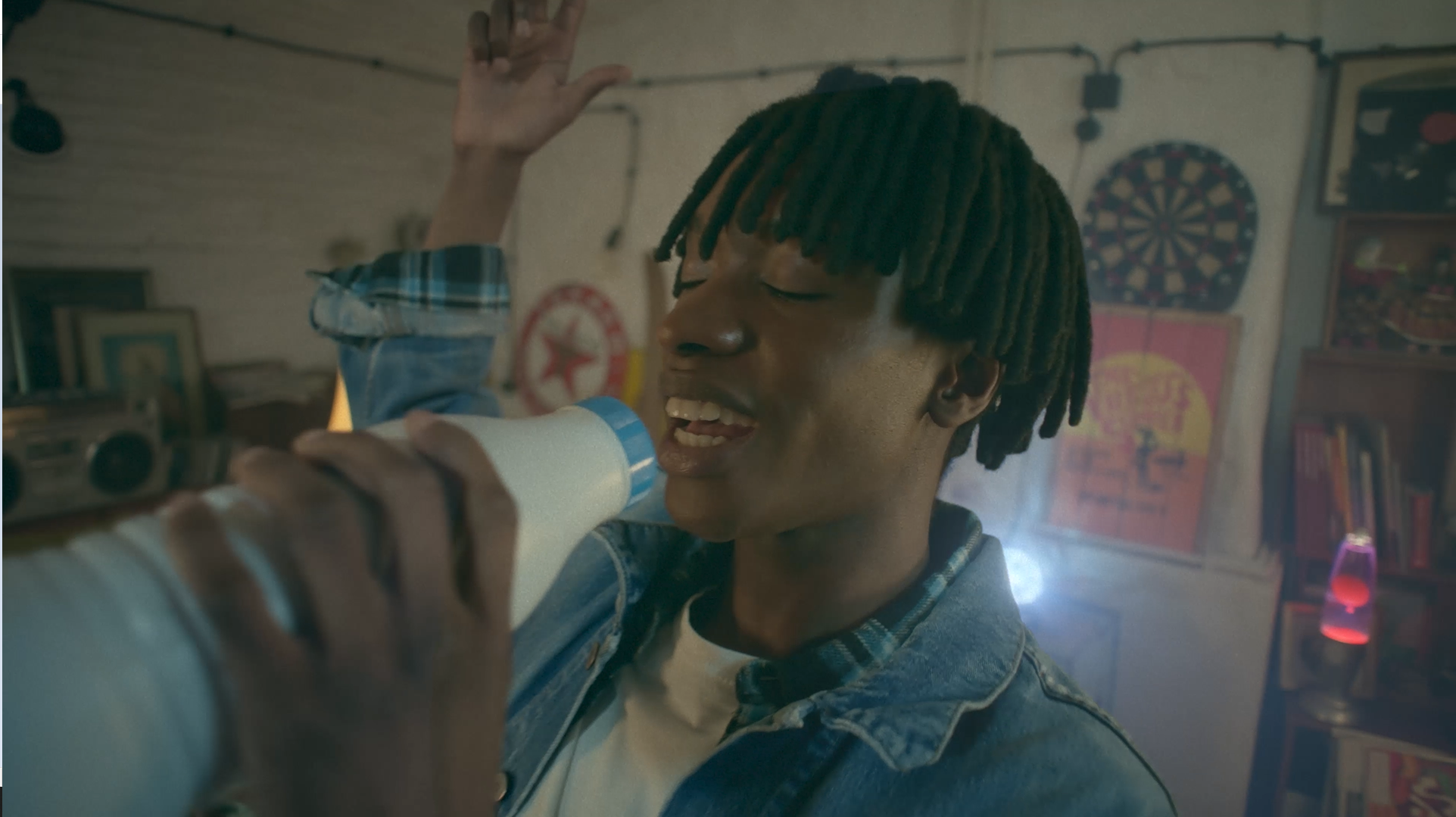 Jeune homme entrain de chanter avec une bouteille de lait en guise de micro, derrière lui une boule disco réalisé en VFX par Tronatic Studio, Paris et Tours