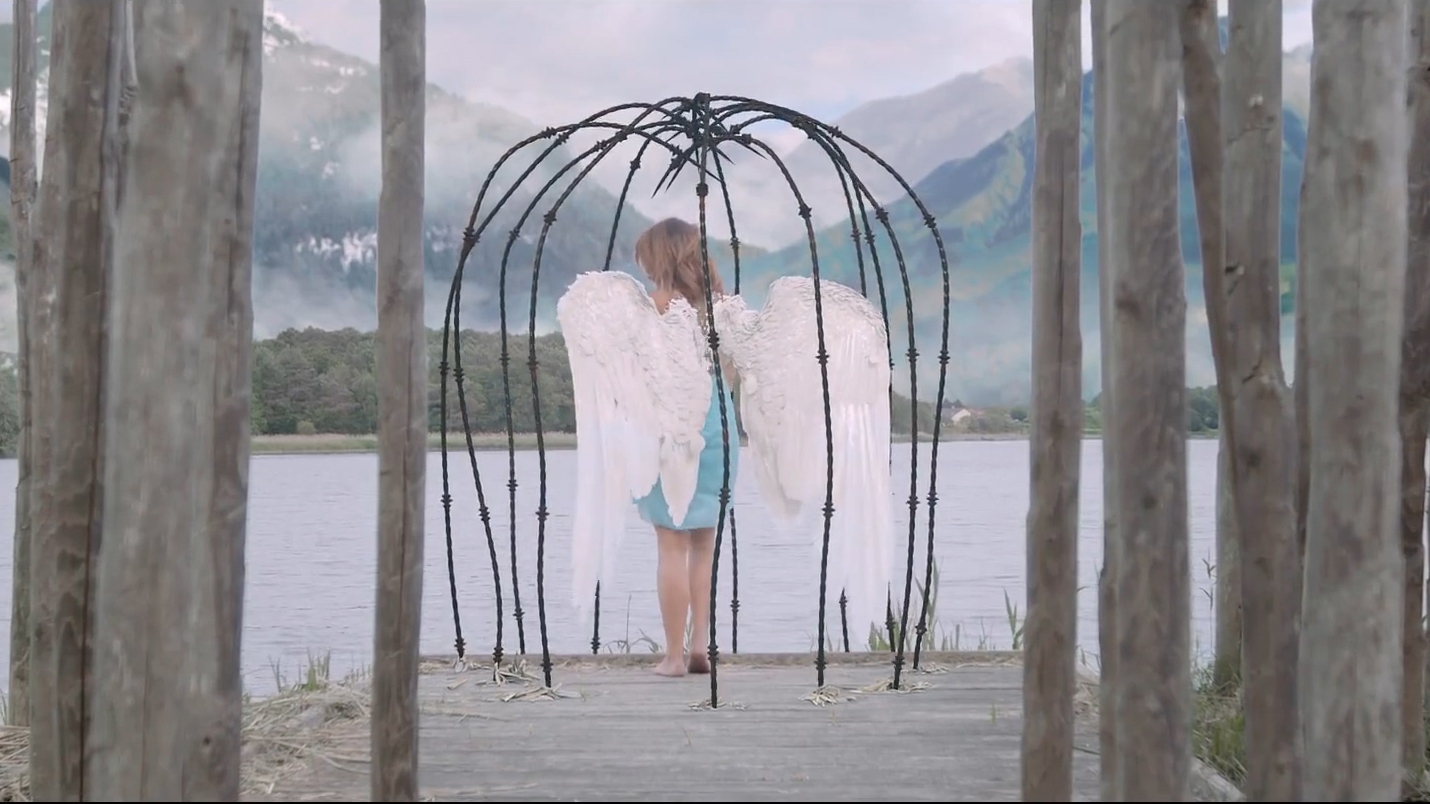 Femme avec des ailes, bord de l'eau, montagnes, emprisonnée, VFX