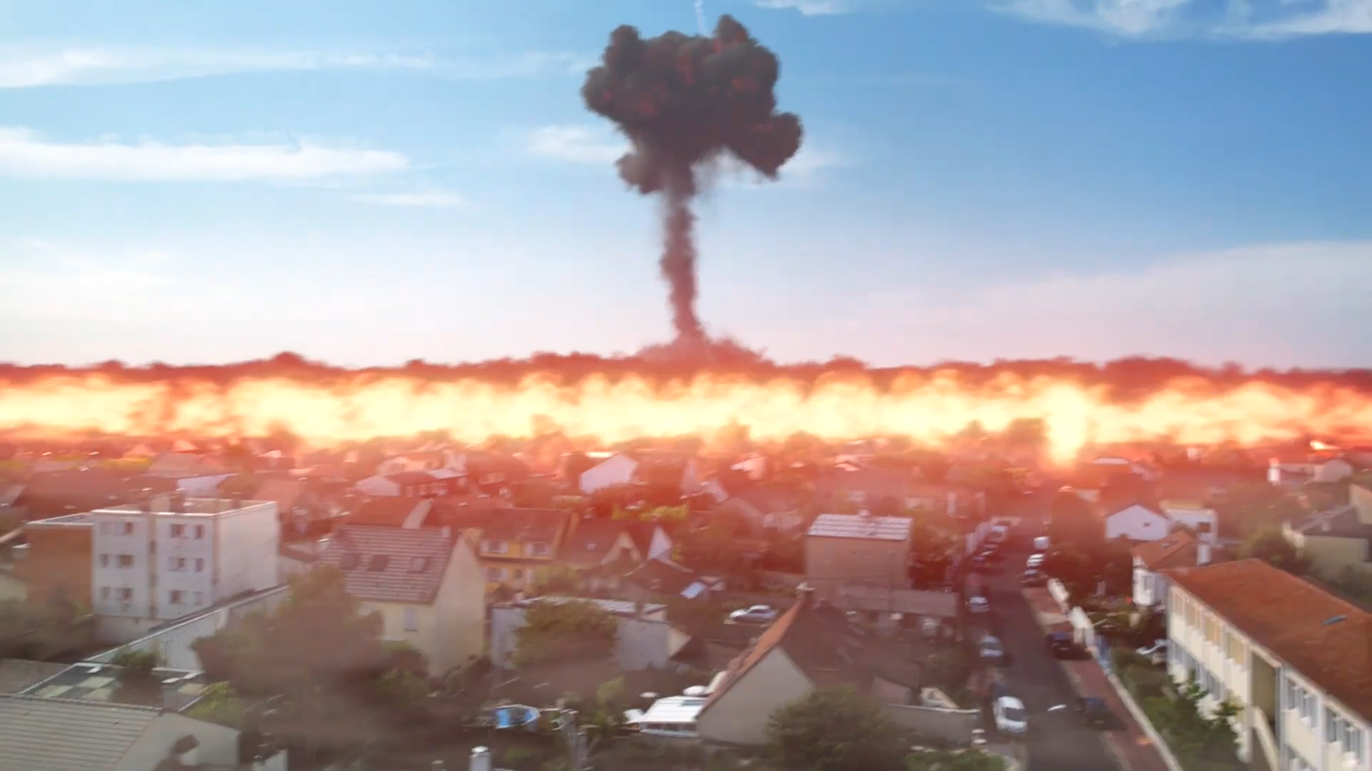 VFX pyrocumulus nucléair vue sur ville et onde de choc avec feu – Vidéo 48H pour sortir d’un Bunker ! INOXTAG