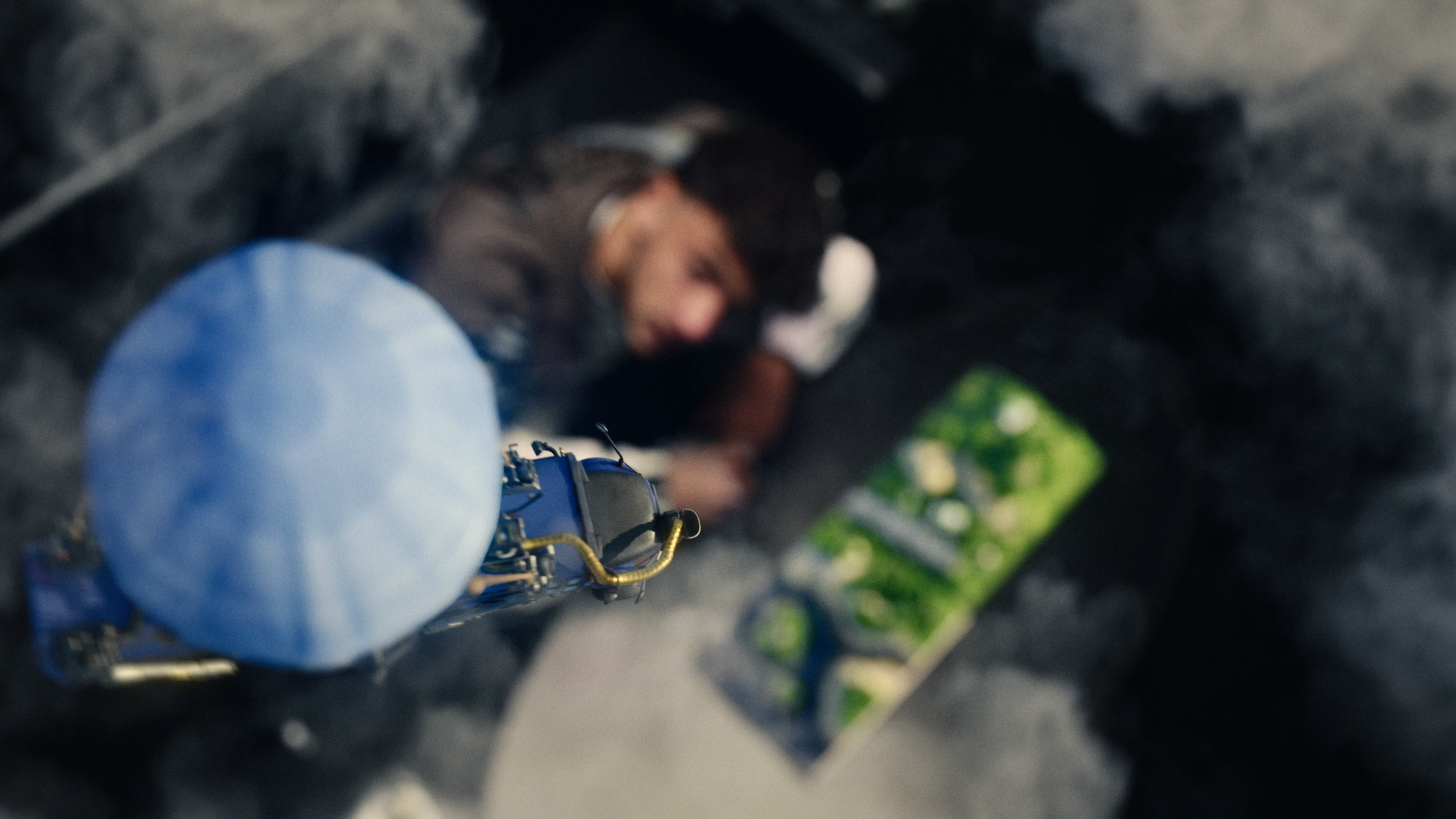 Inoxtag regardant une voiture montgolfière tombant du ciel et allant se poser sur son livre