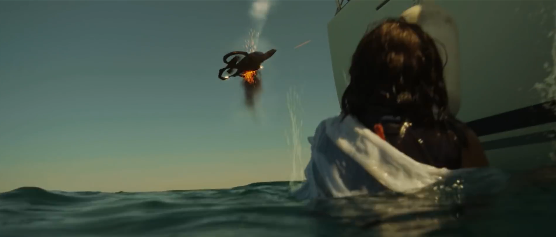 Femme dans l'océan tirant drone avec pistolet fusées de détresse VFX drone touché